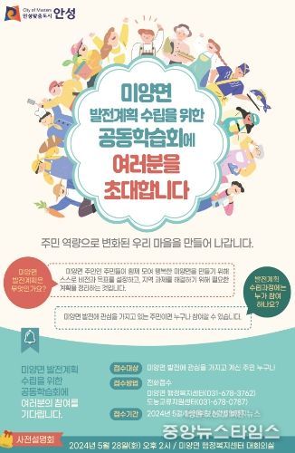 (중앙뉴스타임스 = 방재영 기자) 안성시 시민활동통합지원단 도농교류지원센터에서는 오는 28일 미양면 주민들과 함께 지역정책의 거버넌스를 구축하기 위해 '미양면 발전계획 수립을 위한 공동학습회 사업설명회'를 개최한다.