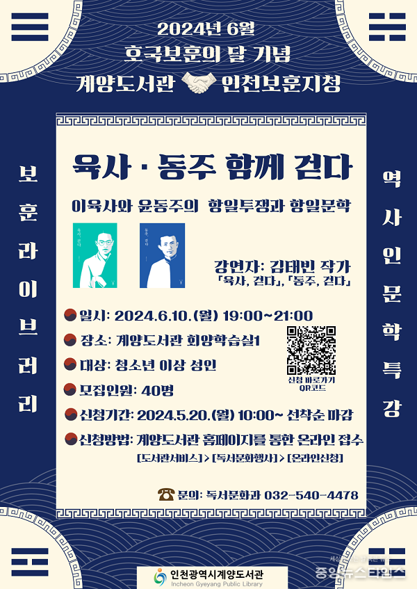 계양도서관은 6월 한 달간 ‘잊지 않겠습니다’를 주제로 호국보훈 관련 도서 북큐레이션을 운영하며, 6월 10일에는 김태빈 작가를 초청해 ‘육사·동주 함께 걷다’ 인문학 특강을 운영한다.