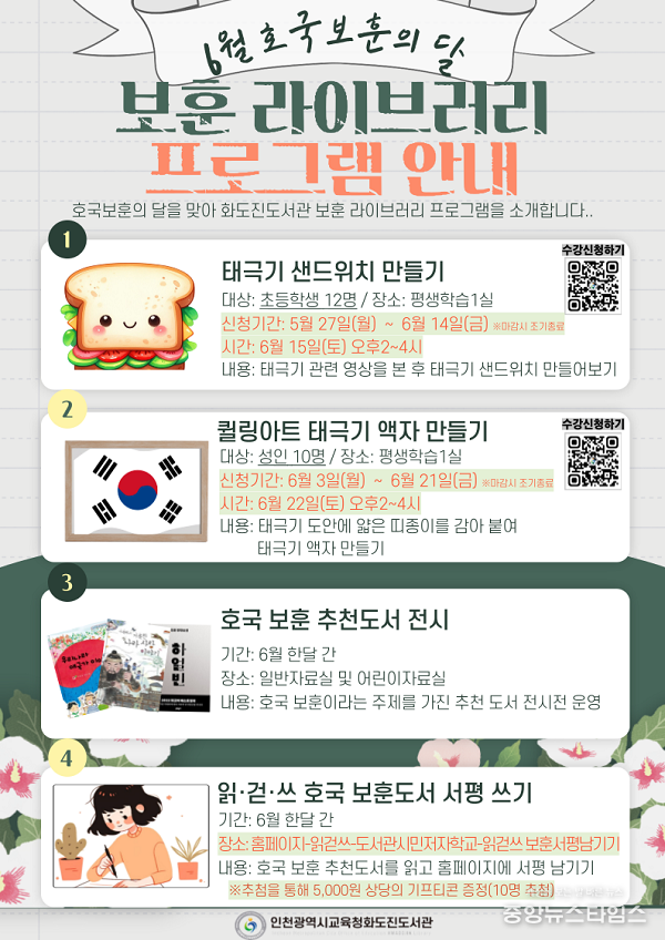 화도진도서관은 6월 한 달 동안 △(초등학생 대상) 태극기 샌드위치 만들기 △(성인 대상) 퀼링아트 태극기 액자 만들기 △호국 보훈 관련 추천 도서 전시 △읽걷쓰 호국 보훈도서 서평 남기기 등 다양한 프로그램을 운영한다.