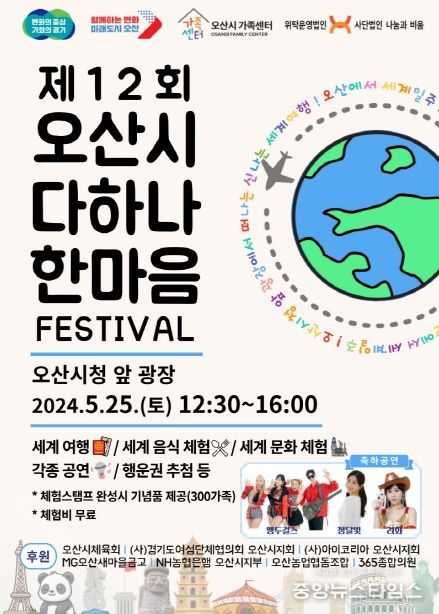 (중앙뉴스타임스 = 이광운 기자) 경기 오산시와 오산시 가족센터는 다문화 가족과 시민들이 함께 소통하기 위한 ‘제12회 오산시 다(多)하나 한마음 축제’를 오는 25일 오산시청 광장에서 개최한다.