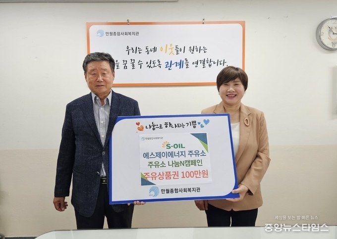 (중앙뉴스타임스 = 방재영 기자) 인천 만월종합사회복지관(관장 임경임)은 ‘2024년 에쓰-오일 주유소 나눔N캠페인’ 지원사업을 통해 S-OIL 에스제이에너지주유소(대표 김덕배)로부터 주유상품권 100만원을 기탁받았다고 24일 밝혔다.