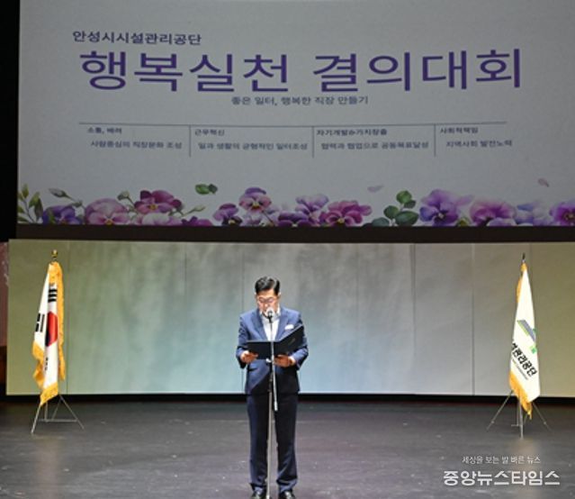 (중앙뉴스타임스 = 방재영 기자) 안성시시설관리공단은 ‘행복한 일터 조성’이라는 조직문화 혁신 지향점과 목표 공유로 공감기반 마련을 위해 지난 28일 안성맞춤랜드 안성남사당 실내공연장에서 전 직원과 함께‘2024년 행복경영 실천 결의대회’를 개최했다.