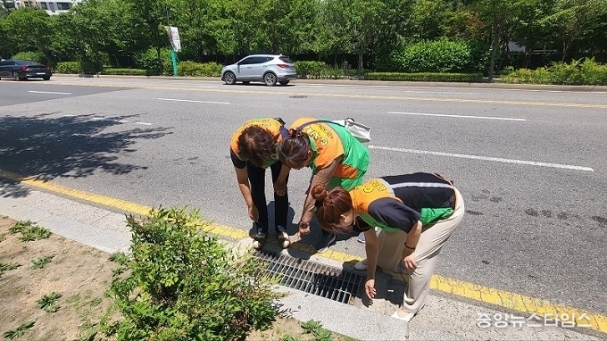 자율방재단 단원들은 풍수해지진 보험 홍보, 도로변 빗물받이 점검, 인도 그늘막 점검을 했다.