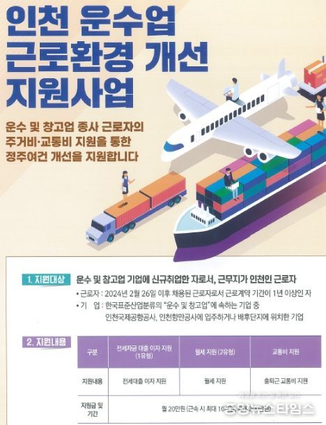 ‘근로환경 개선 지원사업’은 인천지역 운수·창고 근로자를 대상으로 출퇴근 교통비, 주거비(전세대출 이자 지원, 월세 지원)를 월 20만 원씩 최대 200만 원(10개월 근속 기준)까지 지원하는 사업이다. 올해 총 70명을 지원할 방침이다.