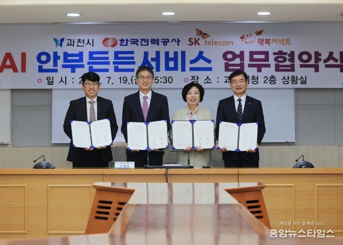 (중앙뉴스타임스 = 방재영 기자) 과천시가 고독사 예방을 위해 사회적 고립 가구의 안부를 24시간 확인하는 ‘AI 안부든든 서비스’의 시범 도입을 추진하는 가운데, 19일 시청 상황실에서 한국전력공사 남서울본부, SK텔레콤, 재단법인 행복커넥트 와 업무협약을 체결했다.