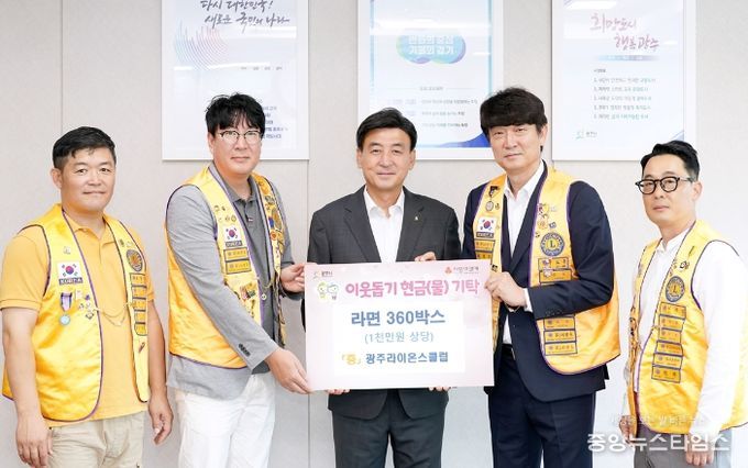 (중앙뉴스타임스 = 방재영 기자) 광주라이온스클럽 구교동 회장 일행은 지난달 31일 광주시청을 방문해 어려운 이웃에게 지원해 달라며 라면 360박스(1천만원 상당)를 기탁했다.