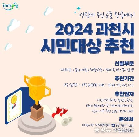 (중앙뉴스타임스 = 방재영 기자) 과천시가 지역사회 발전에 헌신·봉사해 온 시민을 발굴하기 위해 ‘시민대상’ 후보자를 이달 30일까지 추천받는다.