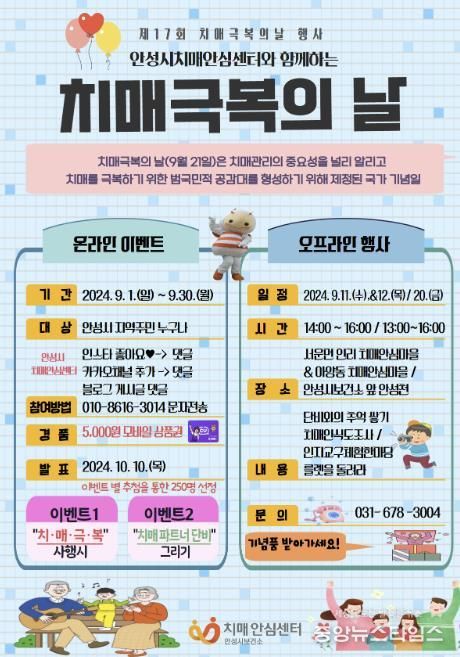 (중앙뉴스타임스 = 방재영 기자) 안성시보건소 치매안심센터는 제17회 치매극복의 날(9.21.)을 맞아 9월 한달간지역사회 치매극복을 위한 온라인 이벤트 및 캠페인 전개 등 다채로운 행사를 진행한다고 3일 밝혔다.