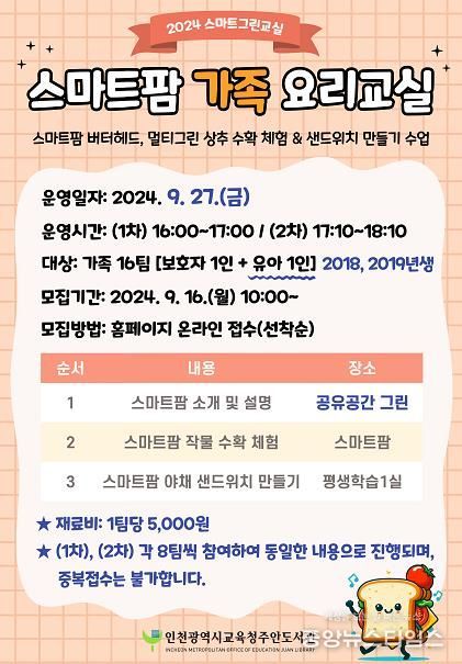 (중앙뉴스타임스 = 방재영 기자) 인천시교육청주안도서관은 특색 사업인 스마트그린교실 사업의 일환으로 오는 27일 5, 6세 유아 가족 16팀을 대상으로 ‘스마트팜 가족 요리교실’을 운영한다.