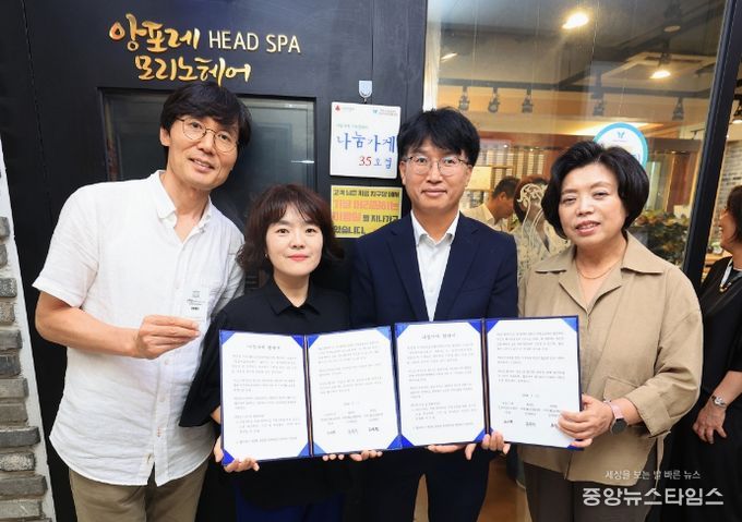 (중앙뉴스타임스 = 방재영 기자) 과천시 원문동은 ‘앙포레모리노헤어 과천점’과 나눔가게 35호점 협약을 맺고 현판식을 진행했다고 19일 밝혔다.