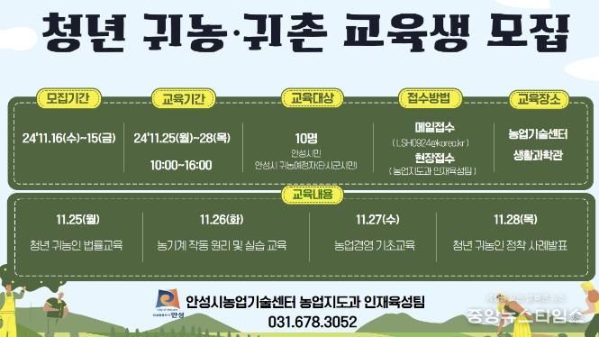 (중앙뉴스타임스 = 방재영 기자) 안성시농업기술센터는 오는 20일까지 청년 귀농·귀촌 교육생을 모집한다고 6일 밝혔다.