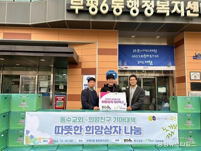 주학선 동수교회 담임목사는 “연말을 맞아 이웃들이 따뜻한 겨울을 보내길 바라는 마음을 담아 희망상자를 준비하게 됐다”며 “물품을 받으시는 분들이 행복하고 뜻깊은 연말을 보내길 바란다”고 전했다.