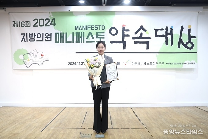 (중앙뉴스타임스 = 방재영 기자) 시흥시의회 김수연 의원이 27일 영등포아트홀에서 열린 제16회 2024 지방의원 매니페스토 약속대상 시상식에서 좋은조례 분야 최우수상을 수상했다.