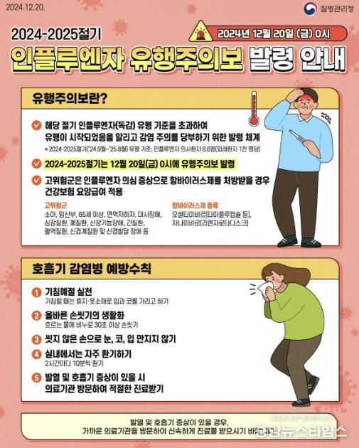 이번 유행 주의보 발령은 최근 인플루엔자 환자 수가 증가하고 있는 상황에 따른 것으로 주요 증상은 38도 이상의 발열, 기침, 인후통을 포함한다.