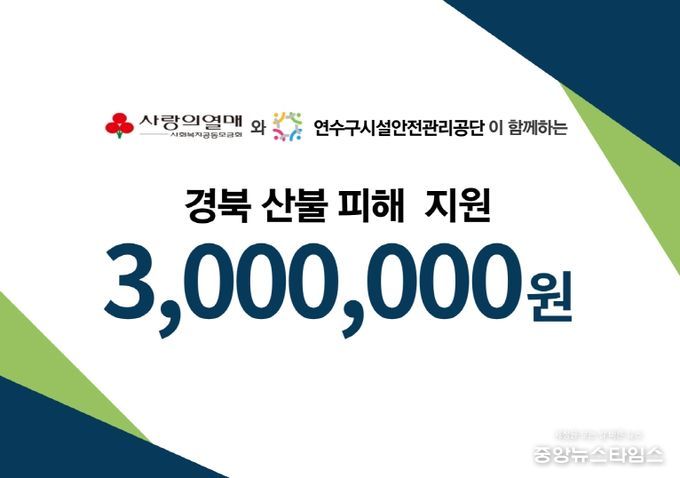 (중앙뉴스타임스 = 방재영 기자) 인천 연수구시설안전관리공단은 최근 발생한 경북 지역 산불 피해 복구를 돕기 위해 4월, 사회복지공동모금회를 통해 300만 원의 성금을 기부했다고 17일 밝혔다.
