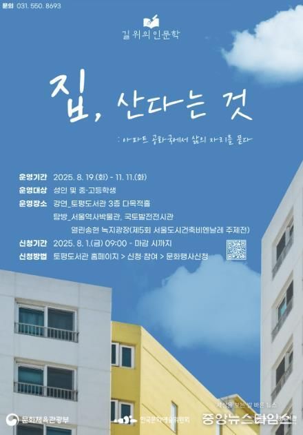 (중앙뉴스타임스 = 방재영 기자) 구리시 토평도서관이 문화체육관광부가 주최하고 한국문화예술위원회가 주관하는 ‘2025년 길 위의 인문학’ 공모 사업에 선정되어, 오는 8월부터 ‘집, 산다는 것 – 아파트 공화국에서 삶의 자리를 묻다’ 프로그램을 운영한다고 31일 밝혔다.