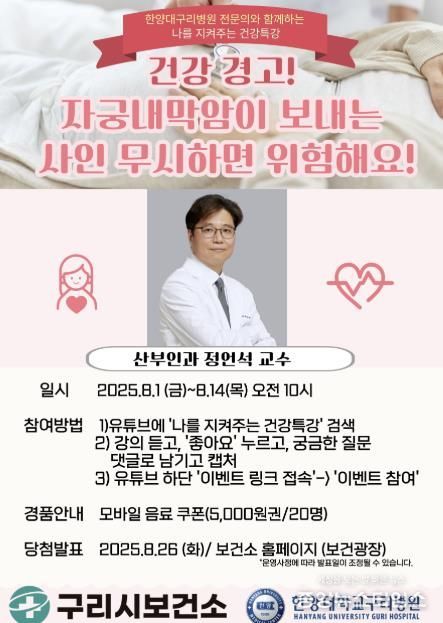 (중앙뉴스타임스 = 방재영 기자) 구리시는 8월 1일부터 구리시 공식 유튜브 채널을 통해 나를 지켜주는 건강특강 ‘건강 경고! 자궁내막암이 보내는 사인, 무시하면 위험해요!’를 송출한다.