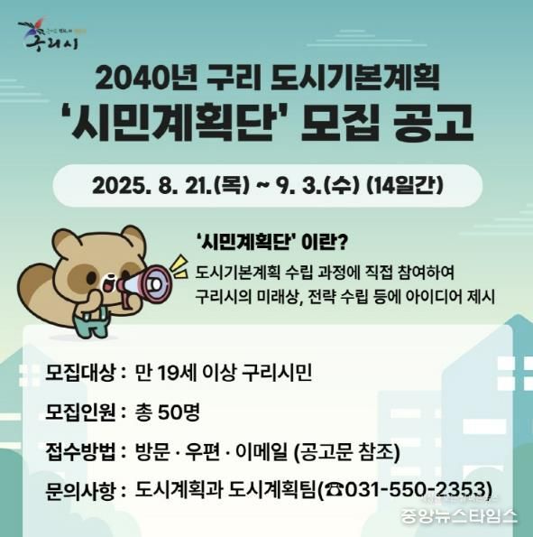 (중앙뉴스타임스 = 방재영 기자) 구리시는 2040년 구리 도시기본계획 수립에 참여하여 구리시의 미래상과 전략 수립 등에 대한 계획 또는 의견을 제시하는 역할을 수행할 시민계획단을 9월 3일까지 모집한다고 21일 밝혔다.
