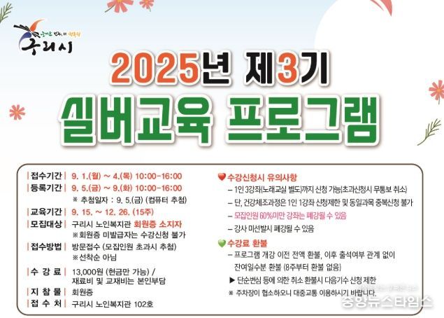 (중앙뉴스타임스 = 방재영 기자) 구리시는 9월 1일부터 4일까지 ‘2025년 3기 실버교육 프로그램’ 수강생 2930명을 모집한다고 27일 밝혔다.