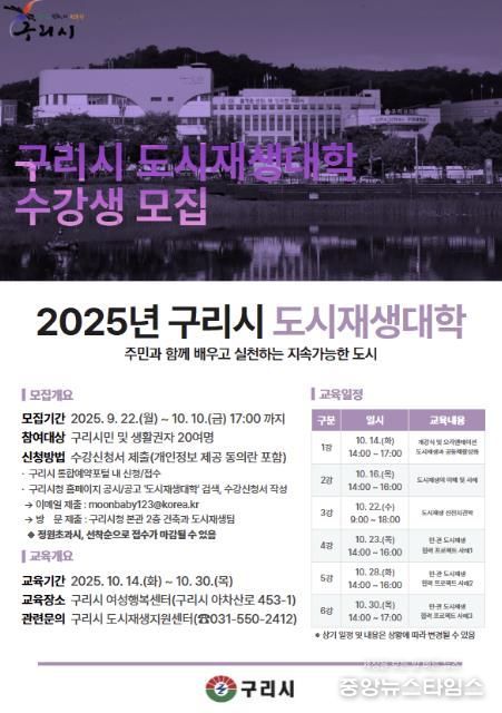 (중앙뉴스타임스 = 방재영 기자) 구리시는 9월 22일부터 10월 10일까지 '2025년 구리시 도시재생 대학' 수강생을 모집한다고 밝혔다.
