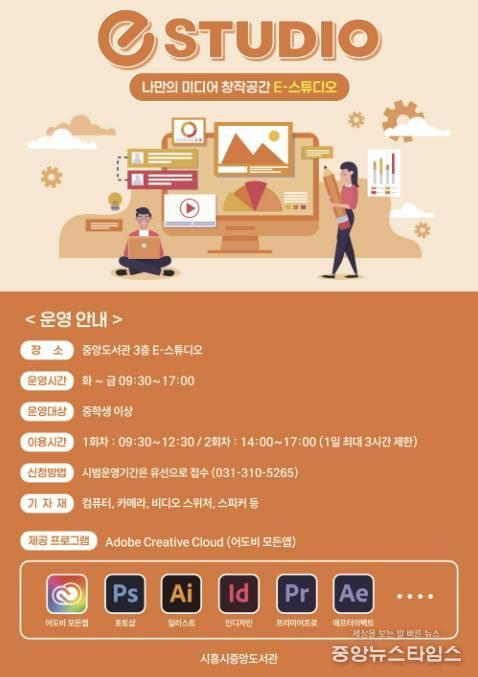 (중앙뉴스타임스 = 방재영 기자) 시흥시중앙도서관은 시민들의 미디어 창작활동을 적극 지원하기 위해 도서관 3층에 위치한 e-스튜디오에 어도비 크리에이티브 클라우드(Adobe Creative Cloud)를 도입해 오는 25일부터 시범 운영을 시작한다.