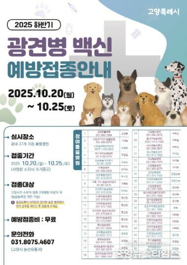 (중앙뉴스타임스 = 방재영 기자) 고양특례시는 2025년 하반기 광견병 예방접종을 10월 20일부터 실시한다고 밝혔다.