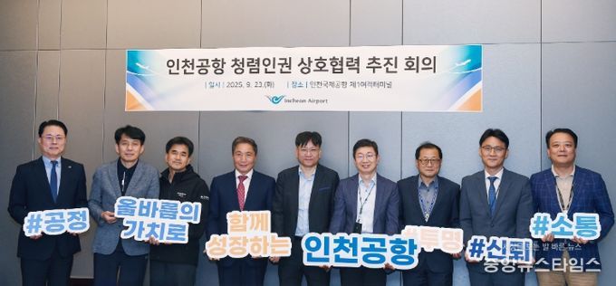 (중앙뉴스타임스 = 방재영 기자) 인천국제공항공사는 지난 23일 제1여객터미널 항공일자리 취업지원센터에서 ‘인천공항 청렴인권 상호협력 추진 회의’를 개최했다고 24일 밝혔다.