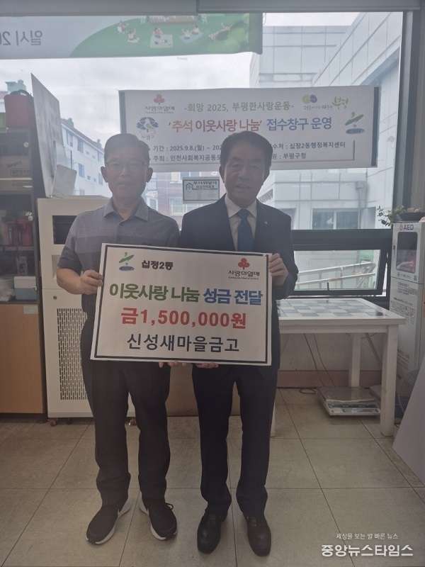 (중앙뉴스타임스 = 방재영 기자) 인천 부평구 십정2동은 24일 신성새마을금고로부터 2025년 추석 이웃사랑 나눔 기부금으로 150만원을 기탁 받았다.