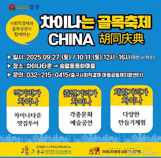 (중앙뉴스타임스 = 방재영 기자) 인천 중구 사회적경제·마을공동체 지원센터는 올해 9월부터 11월까지 인천 차이나타운·동화마을 일원에서 ‘2025년도 사회적경제와 골목상권이 함께하는 '차이나는 골목축제'’를 개최한다고 25일 밝혔다.