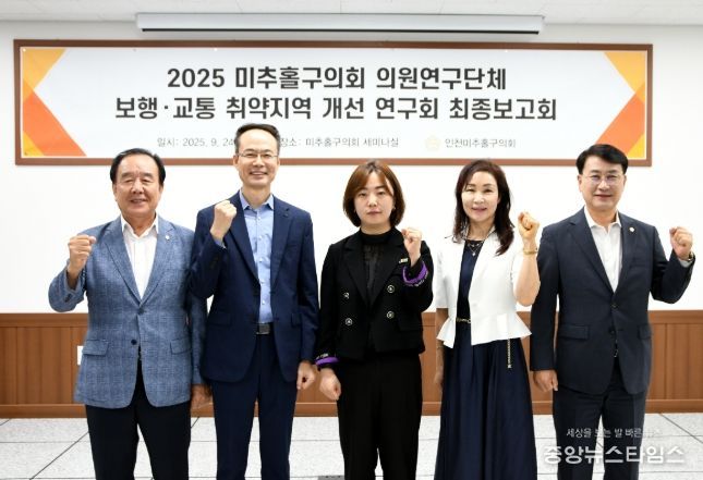 (중앙뉴스타임스 = 방재영 기자) 인천 미추홀구의회 의원연구단체 '보행·교통 취약지역 개선 연구회'(대표의원 박수연, 연구의원 장규철·배상록·김태계)가 2025년 9월 24일 미추홀구의회 세미나실에서 연구용역 최종보고회를 개최하고 성공적으로 마무리했다.