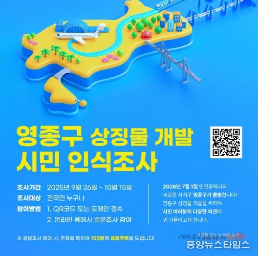 (중앙뉴스타임스 = 방재영 기자) 인천 중구는 인천형 행정 체제 개편에 따라 2026년 7월 1일 공식 출범을 앞둔 ‘영종구’의 정체성과 미래 비전을 담은 ‘상징물(CI, 캐릭터)’ 개발에 본격 돌입했다고 26일 밝혔다.