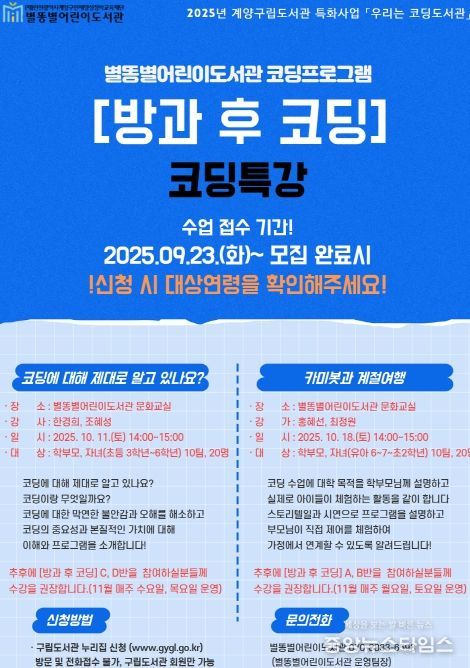 (중앙뉴스타임스 = 방재영 기자) 인천 계양구립별똥별어린이도서관은 2025년부터 실시된 초·중등학교 코딩교육 의무화에 따라 지역 아동들의 디지털 역량 강화를 위해 10월부터 코딩 특화사업 ‘방과 후 코딩’을 운영한다고 26일 밝혔다.