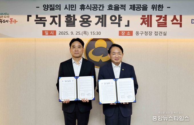 (중앙뉴스타임스 = 방재영 기자) 인천 동구는 지난 25일 동원로엑스㈜(인천㈜ 대표이사 최안석)와‘녹지활용계약’을 체결했다고 밝혔다. 인천 최초로 진행된 이번 계약은 민간기업이 소유한 사유지를 주민에게 열린 녹지로 제공하는 새로운 방식의 민관 협력 모델이다.
