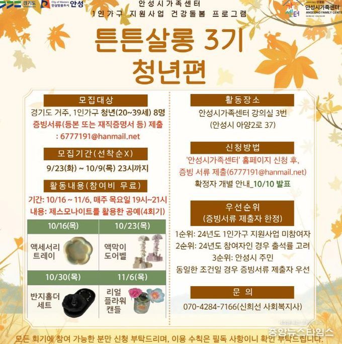 (중앙뉴스타임스 = 방재영 기자) 안성시가족센터는 1인 가구 청년층을 대상으로 ‘건강돌봄 프로그램 – 튼튼살롱 3기’ 참여자를 모집한다고 26일 밝혔다.