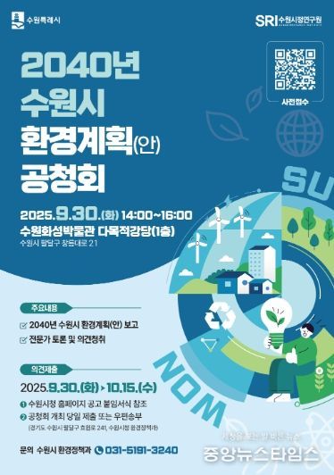 수원시 관계자는 “환경보전과 지속가능한 발전을 목표로, 지역 여건과 시민 제안을 반영한 체계적 환경계획을 수립할 계획”이라며 “공청회에 많은 시민이 참여해 다양한 의견을 제시해 주시길 바란다”고 말했다.
