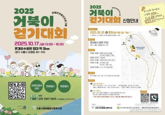 (중앙뉴스타임스 = 이광운 기자) 시흥시는 오는 10월 17일 오후 1시부터 은계호수공원 일대에서 장애인과 비장애인이 함께 걷고 소통하며 문화를 즐기는 ‘거북이 걷기대회’를 연다. 이번 행사는 시흥시대야종합사회복지관이 주관한다.