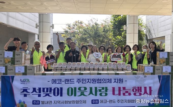 이번 과일 선물세트는 에코랜드 주변지역 주민지원협의체(위원장 이영근)의 주민지원사업 기금으로 마련됐다. 남양주시자원봉사센터(북부분소) 주관으로 별내면 생활개선회와 자원봉사단 회원들이 정성껏 만든 모둠전도 함께 전달돼 추석의 따뜻한 정을 나누는 의미 있는 시간이 됐다.