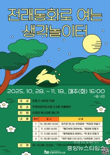 (중앙뉴스타임스 = 이광운 기자) 고양특례시 주엽어린이도서관은 오는 10월 28일부터 11월 18일까지 북스타트 매니저와 함께하는 어린이 책놀이 프로그램 ‘전래동화로 여는 생각놀이터’를 운영한다고 밝혔다.
