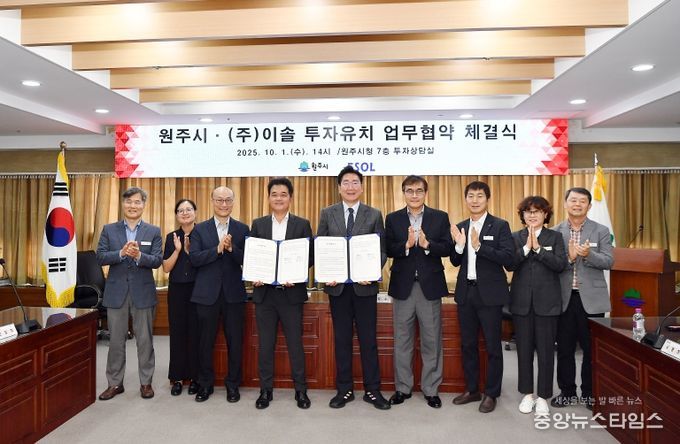 (중앙뉴스타임스 = 방재영 기자) 원주시는 1일 시청 7층 투자상담실에서 ㈜이솔(대표 김병국)과 투자유치 협약(MOU)을 체결했다.