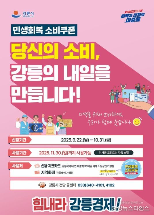 (중앙뉴스타임스 = 방재영 기자) 강릉시 민생회복 소비쿠폰 2차 신청·지급률이 85%로 순항 중인 가운데, 시는 1일부터 10일까지 민생회복 소비쿠폰 2차 소비촉진주간을 운영한다.
