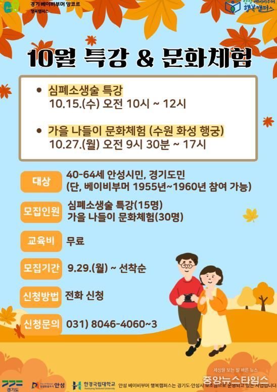 (중앙뉴스타임스 = 방재영 기자) 안성 베이비부머 행복캠퍼스(한경국립대학교 평생교육원)는 오는 15일부터 27일까지 중장년 안성시민(경기도민)을 대상으로 ‘10월 특강(심폐소생술) 및 문화체험(수원화성행궁)’ 프로그램을 운영한다고 2일 밝혔다.