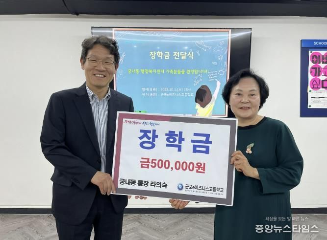 (중앙뉴스타임스 = 방재영 기자) 라의숙 군포시 궁내동통장협의회장은 10월 1일 군포e비즈니스고등학교에 장학금을 전달하며 지역 청소년들의 꿈을 응원하는 뜻깊은 나눔을 실천했다.