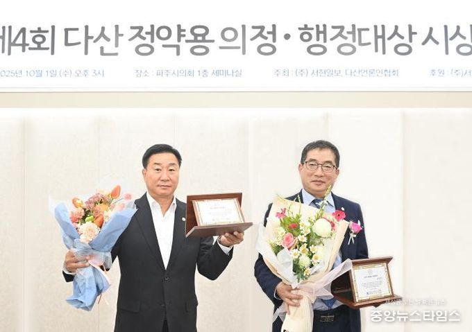 (중앙뉴스타임스 = 방재영 기자) 파주시의회 박대성 의장, 손형배 의원은 1일 파주시의회에서 열린 제4회 다산 정약용 의정·행정대상에 기초의원 부문 대상을 수상했다. 또한 파주를 지역구로 둔 경기도의회 이한국 도의원도 광역의원 부문에 함께 수상되어 의미를 더했다.