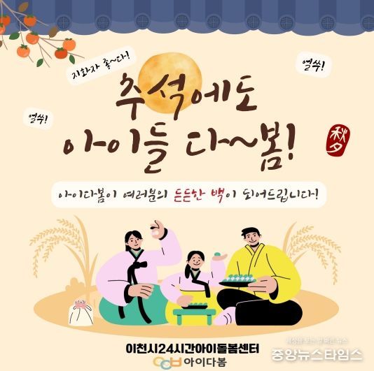 (중앙뉴스타임스 = 방재영 기자) 이천시는 추석 연휴 기간에도 이천시 24시간 아이돌봄센터인 ‘아이다봄’을 365일 24시간 정상 운영해 연휴 중 발생할 수 있는 돌봄 공백을 최소화한다고 밝혔다.