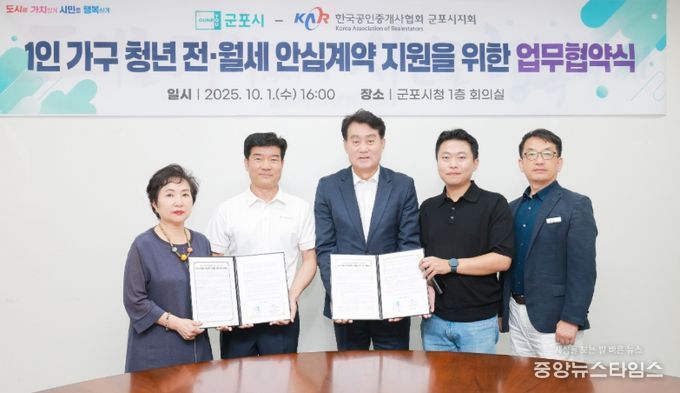 (중앙뉴스타임스 = 방재영 기자) 군포시는 10월 1일 시청 1층 회의실에서 한국공인중개사협회 군포시지회와 청년 1인 가구 전월세 안심계약 지원을 위한 업무협약을 체결했다.
