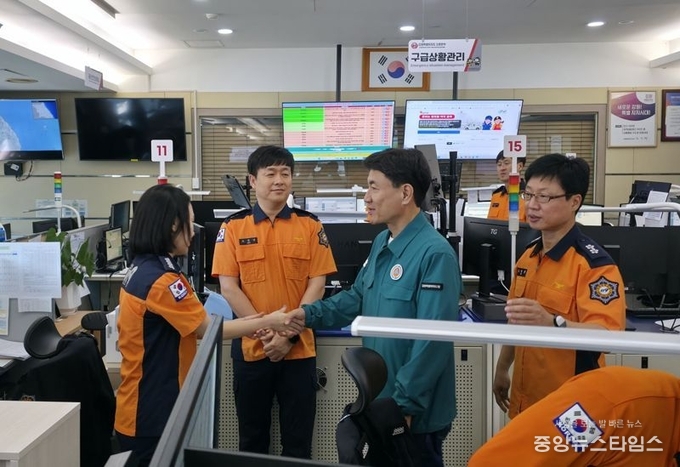 (중앙뉴스타임스 = 방재영 기자) 김진태 강원특별자치도지사는 4일 소방본부 119종합상황실을 방문해 추석명절 특별경계 근무 중인 대원들을 격려했다.