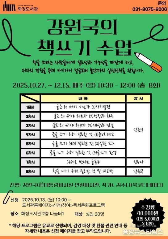 (중앙뉴스타임스 = 방재영 기자) 고양특례시는 10월 27일부터 12월 15일까지 매주 월요일 오전 10시 30분부터 12시까지, 화정도서관 2층 나눔터1에서 ‘강원국의 책쓰기 수업’프로그램을 운영한다고 밝혔다.