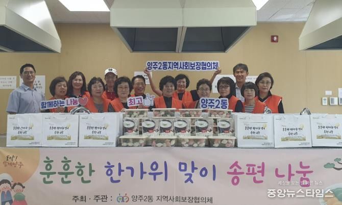 (중앙뉴스타임스 = 방재영 기자) 양주시 양주2동 지역사회보장협의체가 최근 추석을 맞아 관내 취약계층 100가구를 대상으로 송편을 전달했다.