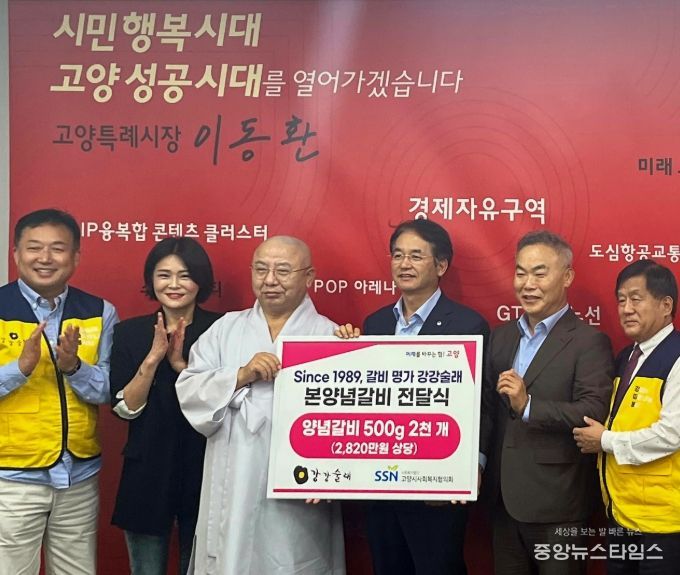 (중앙뉴스타임스 = 방재영 기자) ㈜전한의 외식브랜드 강강술래(대표 노상환)가 10일 고양특례시에 본양념갈비 500g 2000개(2,820만 원 상당)를 기탁했다. 이번 전달식은 고양특례시청 열린시장실에서 진행됐으며, 이동환 고양특례시장, 김민숙 고양특례시의원(고양, 관산, 원신), 노상환 강강술래 대표, 김응화 고양시사회복지협의회 회장이 함께 자리했다.