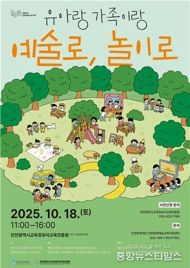 (중앙뉴스타임스 = 방재영 기자) (재)인천문화재단은 인천광역시교육청유아교육진흥원과 협력하여 2025 대한민국 문 화예술교육 축제와 연계된 '유아랑 가족이랑 예술로, 놀이로' 행사를 10월 18일 오전 11시부터 오후 4시까지 인천광역시교육청유아교육진흥원에서 개최한다.